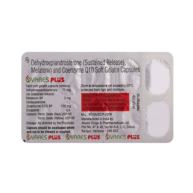 Ovares Plus Capsule SR is a combination of three medicines: Coenzyme Q10, Dehydroepiandrosterone (Micronized) and Melatonin. Coenzyme Q10 is a precursor of natural male and female hormones. Dehydroepiandrosterone (Micronized) is a hormone which works as an antioxidant protecting the body from damage by chemicals (free radicals). Melatonin provides essential nutrients.