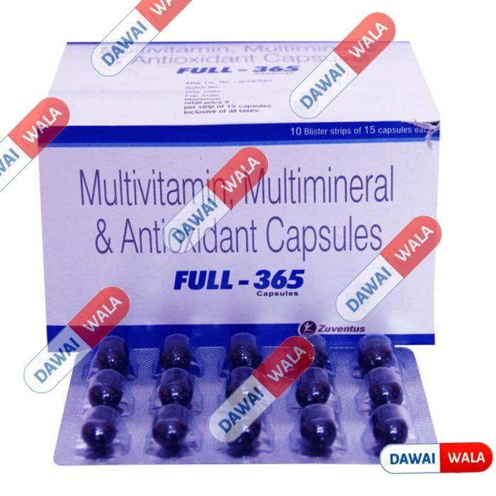 Full 365 Capsule is a nutritional supplement used for general weakness associated with various conditions. It contains a combination of multivitamins, multi-minerals, and antioxidants. The capsule works by acting on the megaloblastic bone marrow to produce normoblasts or normal healthy cells and correcting vitamin deficiencies. It also helps in metabolising carbohydrates thus maintaining normal growth.