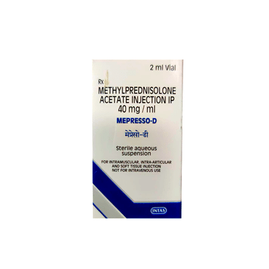 Mepresso D 40mg Injection is usually given as an injection by your doctor into a vein, joint, or muscle. The amount you are given will depend on what you are being treated for and how much you need to control your symptoms. If you are using this medication at home, learn exactly how to do it correctly from your doctor. You should always take the amount prescribed. Do not take a larger dose or use it more often. Taking a higher dose will not improve your condition faster, and your risk of side effects will increase. Keep taking it regularly even if you feel well. Do not suddenly stop this medication as your condition may become worse. It should always be stopped gradually.The most common side effects of this medicine include nausea, headache, dizziness, sweating, and swelling in your hands or ankles (edema). If these side effects bother you or will not go away, your doctor may suggest ways of preventing or reducing them. Steroids may also lower your ability to fight infections so avoid being near people who might pass on infections such as measles, chickenpox, or flu. Do not receive a live vaccine while using this medicine. Steroids can affect growth in children.Before using this medicine, you should tell your doctor if you have brittle bones (osteoporosis), mood disorders, high blood pressure, or liver disease. Also, tell your doctor if you have diabetes, this medicine may increase blood glucose levels which can worsen diabetes. Many other drugs may affect, or be affected by, this medicine so let your doctor know all other medicines you are using. This is done to make sure it is safe to use. You should also tell your doctor if you are pregnant, planning to become pregnant or breastfeeding. If this medicine is used for a long time you will be asked for regular monitoring of blood sugar, blood pressure, bone density as well as an eye examination.