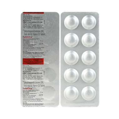 Safeova Tablet is a combination of three medicines : Dehydroepiandrosterone (Micronized), Folic Acid, and Vitamin D3. Dehydroepiandrosterone (Micronized) is a hormonal medication. It gets converted into sex hormones in the body which are essential for the production and development of healthy eggs. Thus, it helps treat female infertility. Folic Acid is a form of vitamin B. It plays a vital role in the formation of red blood cells, which carry oxygen throughout the body. It is also essential in pregnancy due to its role in the development of the unborn baby's brain and spinal cord. Vitamin D3 is a form of vitamin D. It raises vitamin D levels in your blood. This in turn raises calcium levels in your blood by helping you absorb more calcium from food.