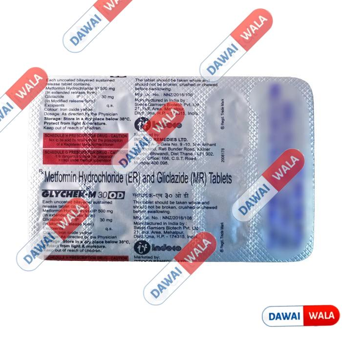 Glychek-M OD 30mg/500mg Tablet should be taken with food. Take it regularly at the same time each day to get the most benefit. Your doctor will decide what dose is best for you and this may change from time to time according to how it is working according to your blood sugar levels.Keep taking this medicine, even if you feel well or your blood sugar levels are controlled. If you stop it without consulting your doctor, your blood sugar levels could rise and put you at risk of kidney damage, blindness, nerve problems and loss of limbs. Remember that it is only part of a treatment program that should also include a healthy diet, regular exercise, and weight reduction as advised by your doctor. Your lifestyle plays a big part in controlling diabetes.The most common side effect of Glychek-M OD 30mg/500mg Tablet are low blood glucose levels (hypoglycemia), constipation, and vomiting. Make sure you recognize the signs of having low blood glucose levels, such as sweating, dizziness, headache, and shaking and know how to deal with it. To prevent this, it's important to have regular meals and always carry a fast-acting source of glucose such as sugary food or fruit juice with you. Drinking alcohol can also increase your risk of low blood sugar levels and should be avoided. Other side effects that may be seen on taking this medicine include taste changes, nausea, diarrhea, stomach pain, headache, and upper respiratory tract infection. Some people may find that they put on weight with this medicine.You should not take it if you have type 1 diabetes mellitus, if you have diabetic ketoacidosis (high levels of acid in your blood), or if you have severe kidney or liver disease. Before taking this medicine, tell your doctor if you have ever had heart disease. It may not be suitable. Pregnant or breastfeeding women should also consult their doctor before taking it. Your blood sugar levels should be checked regularly and your doctor may also advise blood tests to monitor your blood cell counts and liver function.