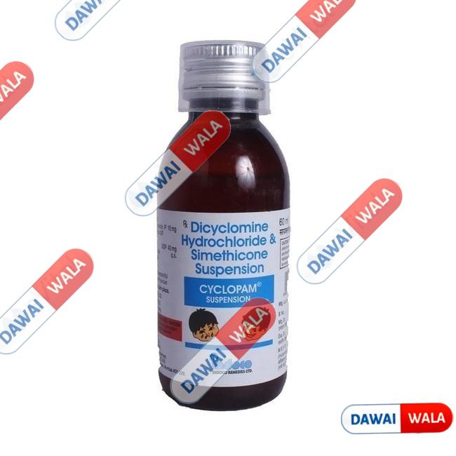 Cyclopam Suspension is a mixture of two active medicines Dicyclomine, an antispasmodic agent, and Simethicone, an antifoaming medicine. Dicyclomine works by relaxing the muscles in your stomach and gut (intestine). It stops sudden muscle contractions (spasms), thereby relieving abdominal cramps and pain. Whereas, Simethicone disintegrates gas bubbles and allows easy passage of gas.