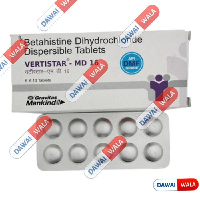 Vertistar -MD 16 Tablet is a histamine analog. It works by improving the blood flow in the inner ear which reduces the pressure of excess fluid there. Excess fluid can send signals to the brain causing nausea, dizziness or spinning sensations (symptoms of Ménière's disease). Vertistar -MD 16 Tablet additionally dampens down the nerve signals sent from the inner ear to the brain relieving the symptoms of Ménière's disease.